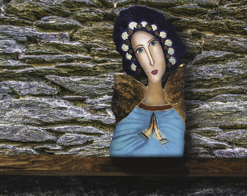 Peaceful Angel Dressed in Blue is Praying / Golden Textured Wings
